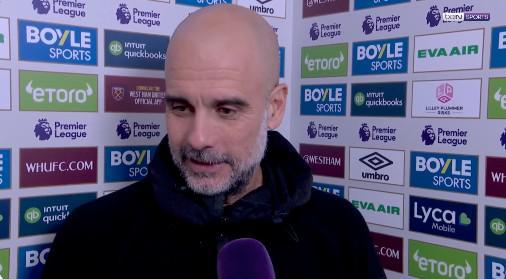 英超第30轮,曼城客场1-1战平西汉姆联,曼城主帅瓜迪奥拉赛后接受了拜因体育的采访。